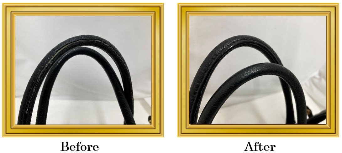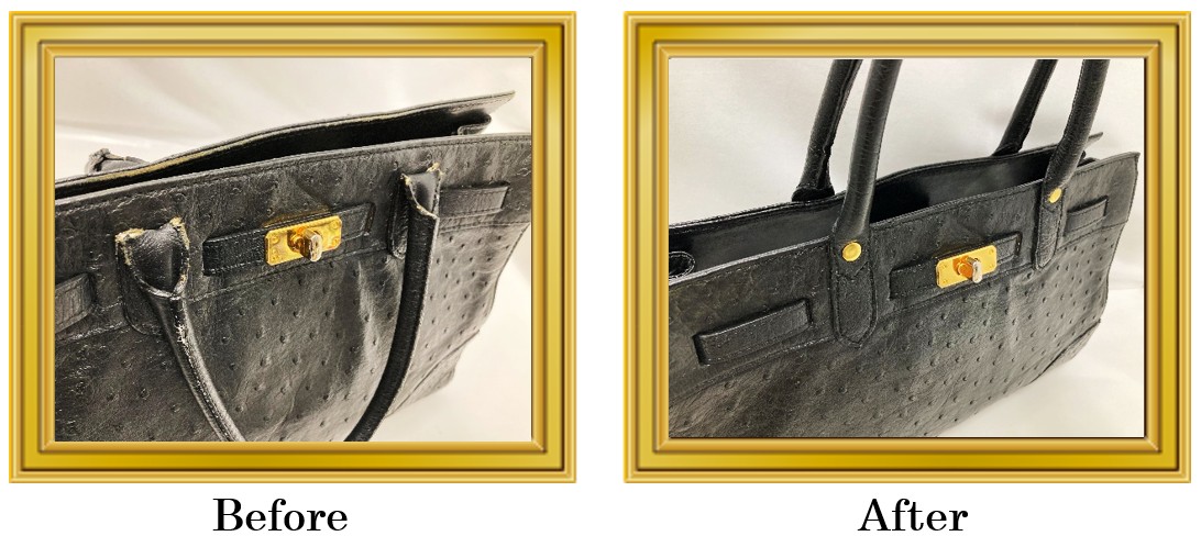 リペア例618:2本手バッグ(オーストリッチ)黒 コバ再塗,カシメ留め、擦れ補色